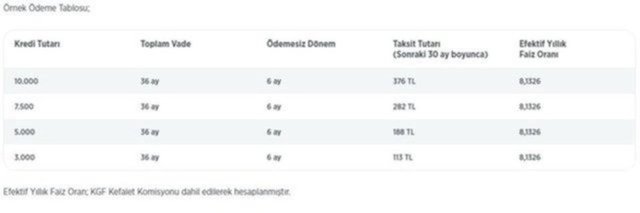 6 ayı ödemesiz dönemli, 36 ay vadeli,