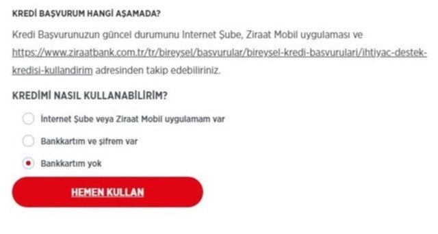 Eğer bunların hiç biri yok ise https://www.ziraatbank.com.tr/tr/bireysel/basvurular/bireysel-kredi-basvurulari/ihtiyac-destek-kredisi-kullandirim bu adres üzerinden sorgulama yapabilirsiniz. Buraya tıkladığınızda karşınıza şu şekilde bir ekran çıkacaktır.