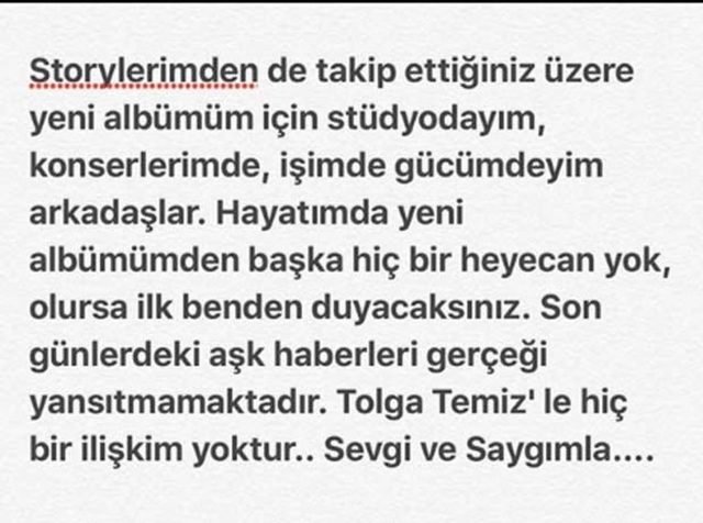 Ünlü şarkıcı, "Sosyal medya hesabımı takip ettiğiniz üzere yeni albümüm için stüdyodayım, konserlerimde, işimde gücümdeyim arkadaşlar. Hayatımda yeni albümümden başka hiç bir heyecan yok, olursa ilk benden duyacaksınız. Son günlerdeki aşk haberleri gerçeği yansıtmamaktadır. Tolga Temiz’le hiç bir ilişkim yoktur. Sevgi ve saygımla" ifadelerini kullandı.
